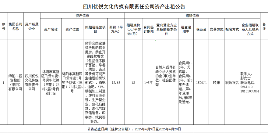 四川优悦文化传媒有限责任公司资产出租公告