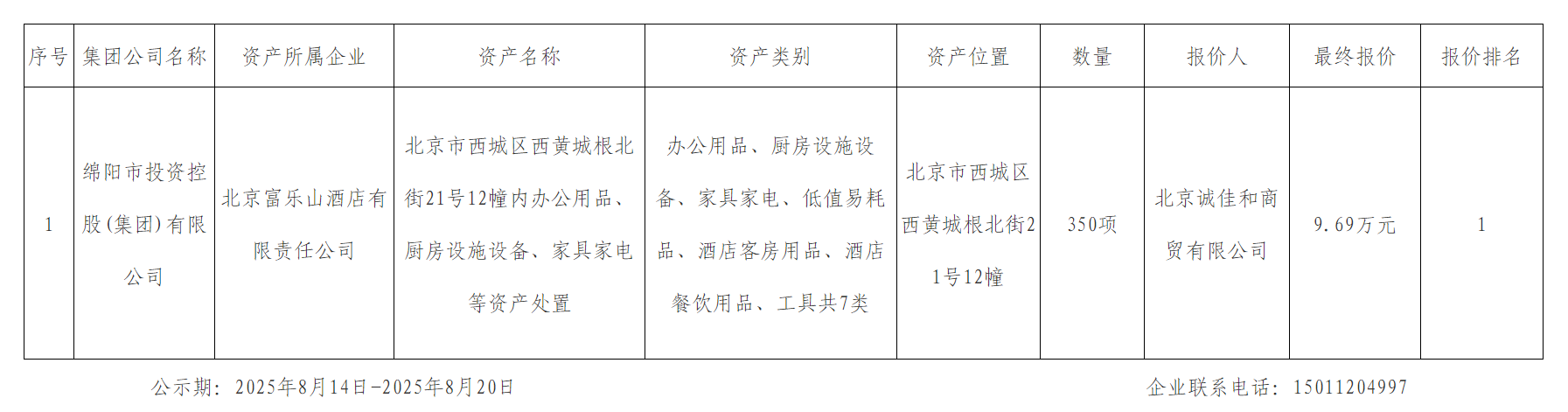 北京富乐山酒店有限责任公司资产处置结果公示