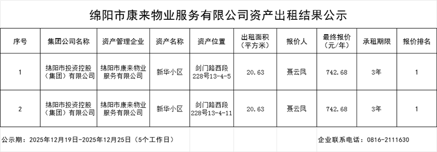 绵阳市康来物业服务有限公司资产出租结果公示