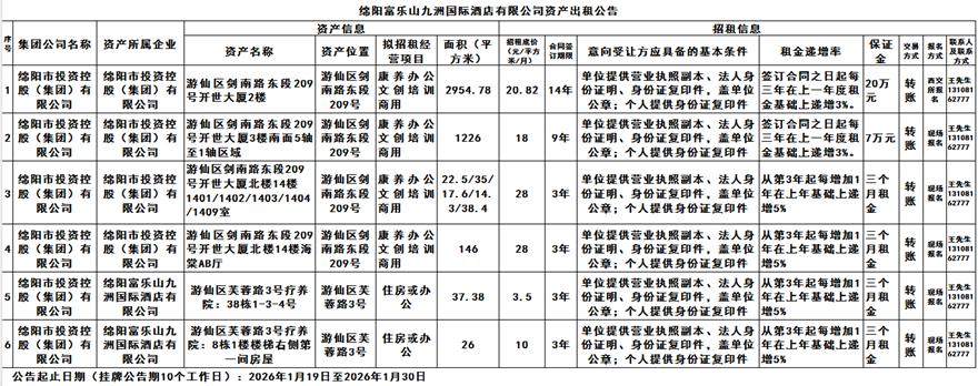 绵阳富乐山九洲国际酒店有限公司资产出租公告