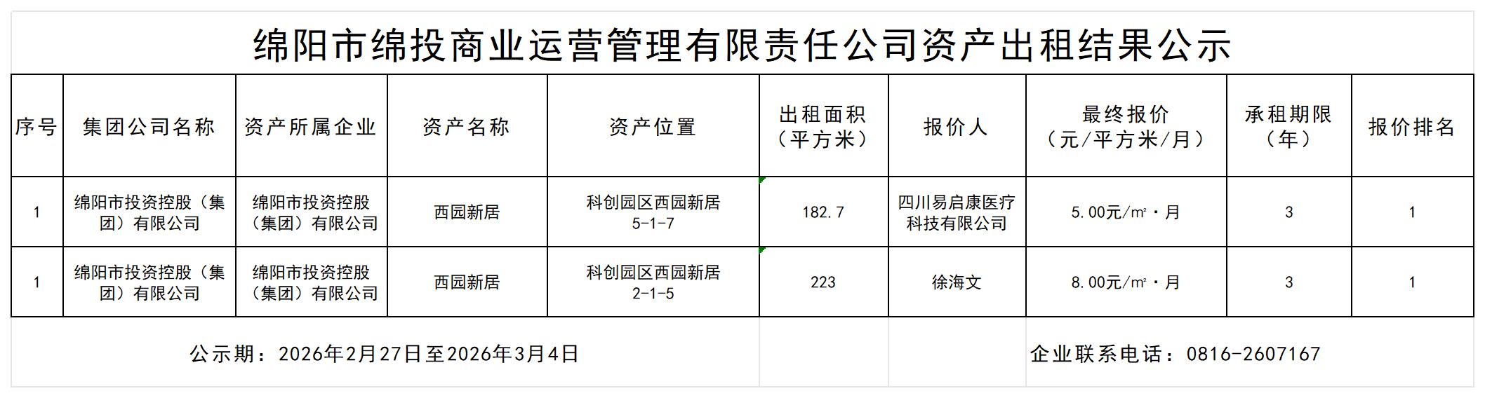绵阳市MK体育商业运营管理有限责任公司资产出租结果公示