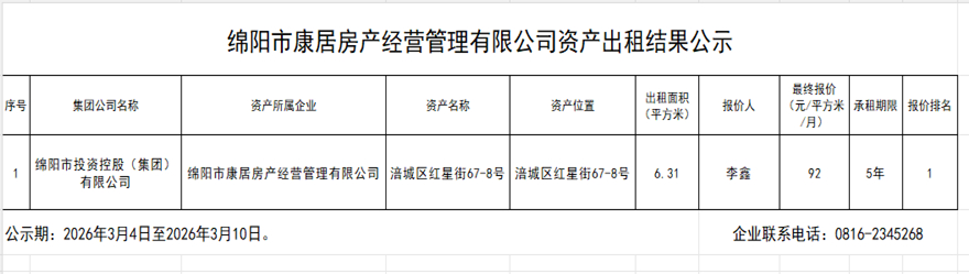 绵阳市康居房产经营管理有限公司资产出租结果公示