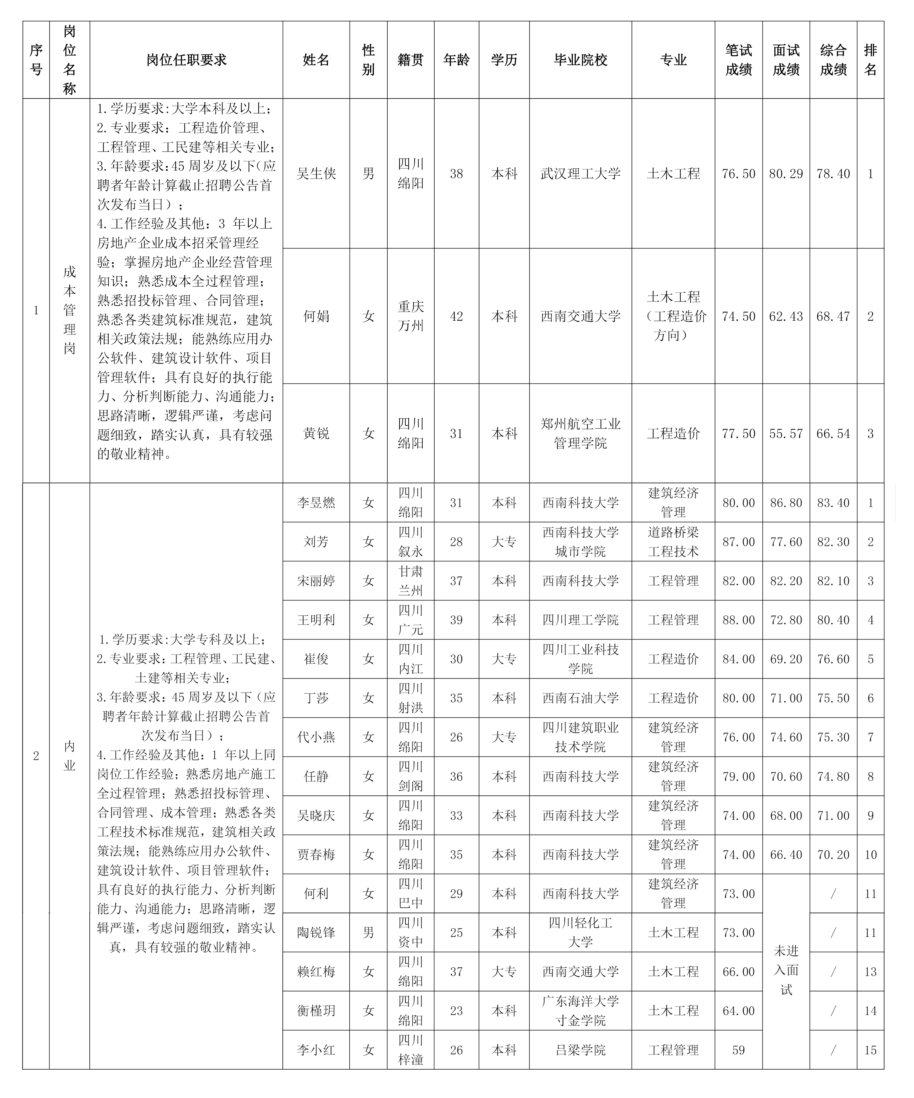 【公开招聘】绵阳市MK体育置地有限公司关于成本管理岗等岗位测试成绩的公示