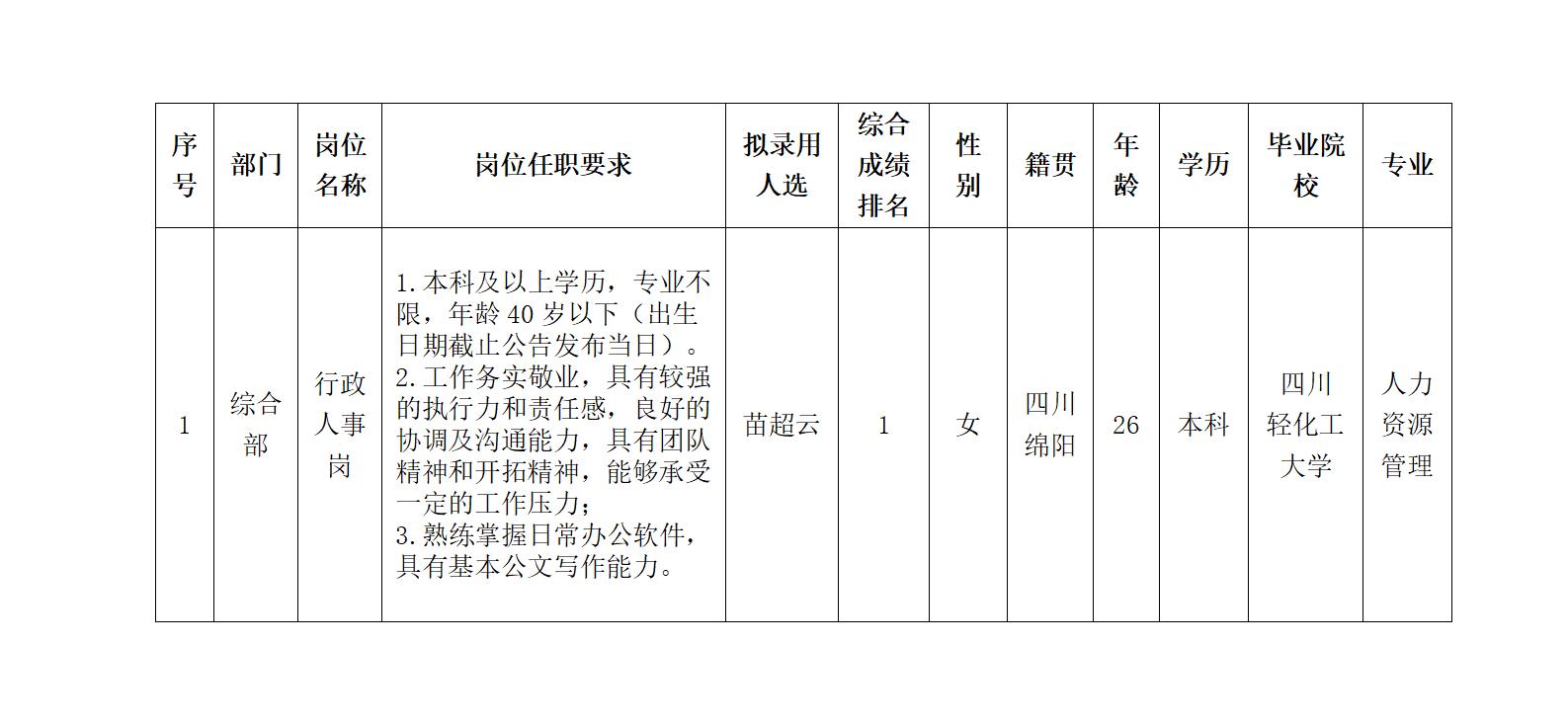 根据四川绵江能源有限公司发布的招聘公告及招聘相关规定,经笔试、面试、考察、体检等程序,拟录用苗超云同志到四川绵江能源有限公司工作,现予以公示,具体情况如下: