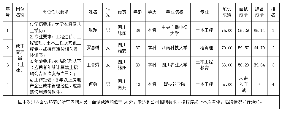 根据绵阳市MK体育置地有限公司发布的招聘公告及招聘相关规定,经笔试、面试等程序,现将笔试、面试成绩予以公示。