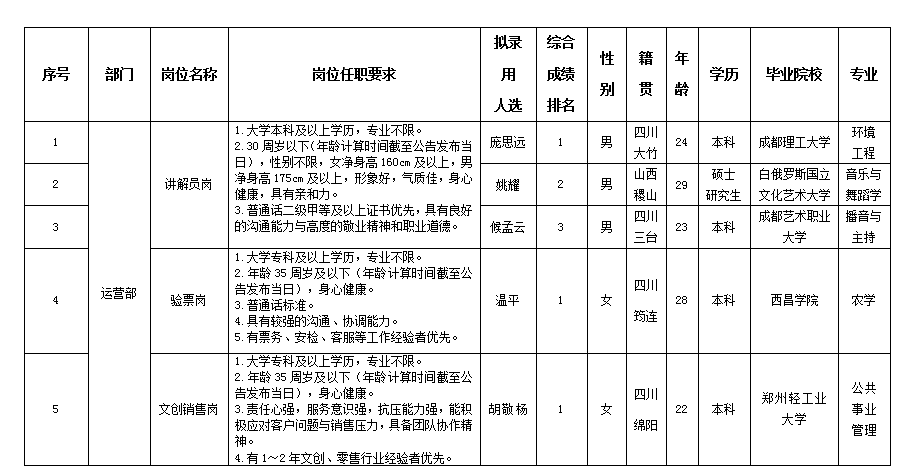 根据四川越王楼文化传播有限公司发布的招聘公告及招聘相关规定,经笔试、面试、考察、体检等程序,拟录用庞思远等同志到越王楼公司工作,现予以公示,具体情况如下:
