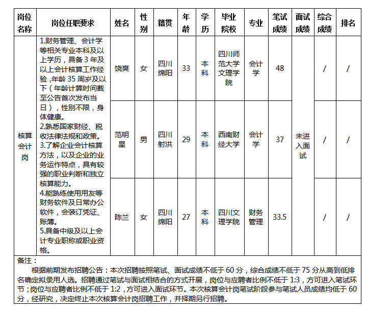 根据四川西津物流有限责任公司发布的招聘公告及招聘相关规定,经笔试,现将笔试成绩予以公示。