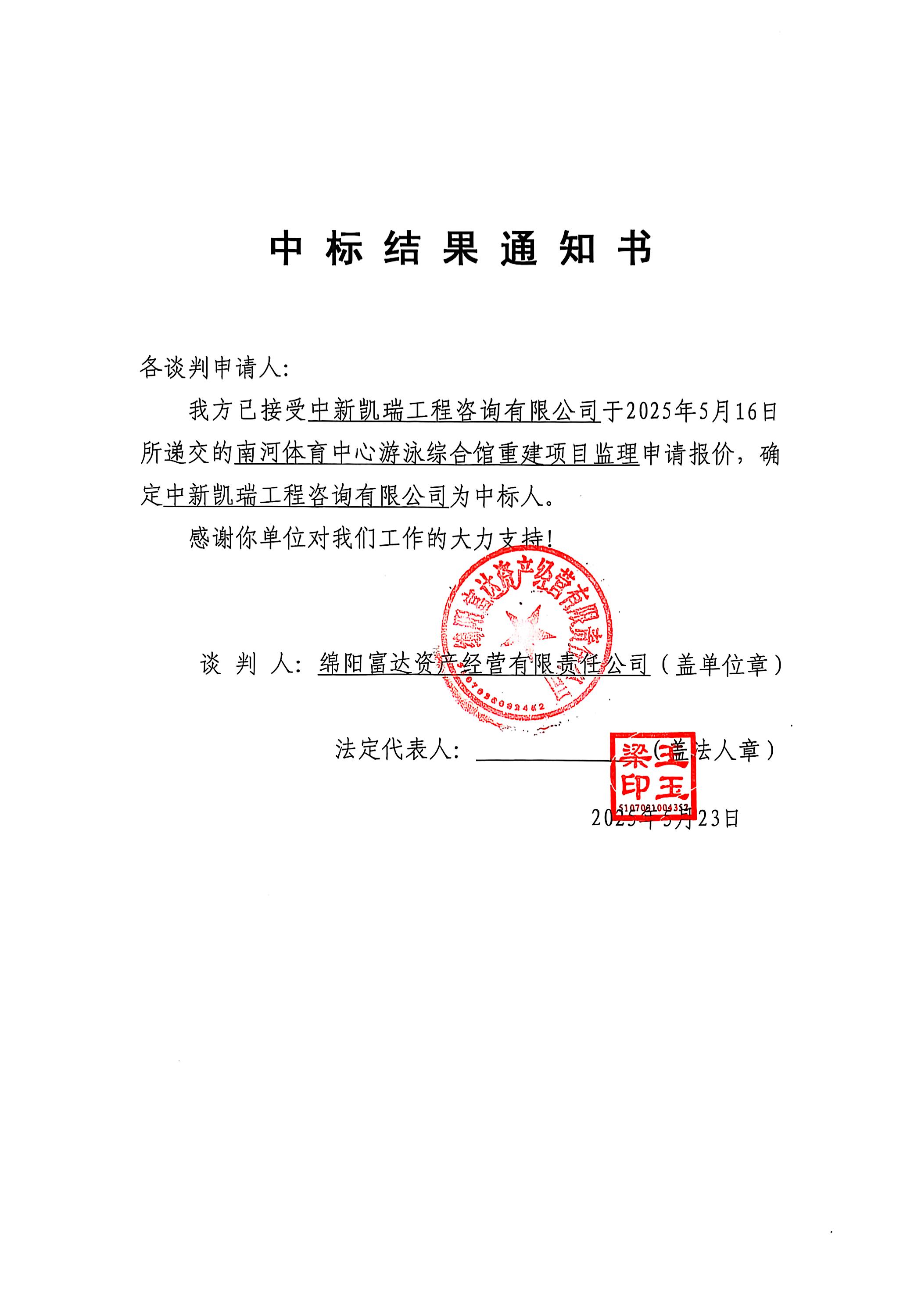南河体育中心游泳综合馆重建项目监理中标结果通知